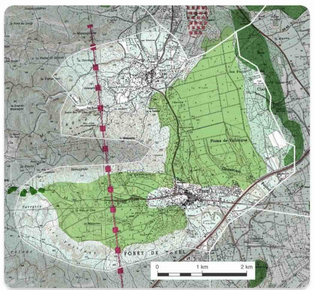 Située sur la commune de Tavel, la centrale solaire du Campey se veut à l’écart du tissu urbain et dans la continuité du poste source existant. En réalité, elle s’implante entièrement en milieu naturel, au cœur de la forêt communale, sur 56,2 ha répartis de part et d’autre de la RD4, avec près de 95 000 modules et des kilomètres de pistes et clôtures. La proximité du poste source réduit certes le raccordement, mais densifie un pôle industriel déjà lourd (lignes THT, pylônes, sous-station), et concentre les risques — notamment incendie — car les obligations légales de débroussaillement (OLD) et les aménagements de défense incendie majorent la surface réellement défrichée au-delà des seuls panneaux. Surtout, le projet dépasse le cadre du SCoT Gard Rhodanien (qui n’identifie que 40 ha pour des EnR au sol) et n’apporte pas la preuve d’une alternative sérieuse sur des sites déjà anthropisés, contrairement aux recommandations de la MRAe.